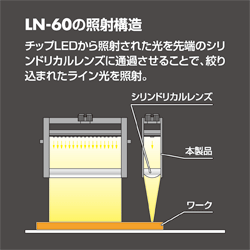集光線形照明LN series:因為使用了柱形透鏡,照射光匯聚成一條光線,產(chǎn)生高亮度線光源。
